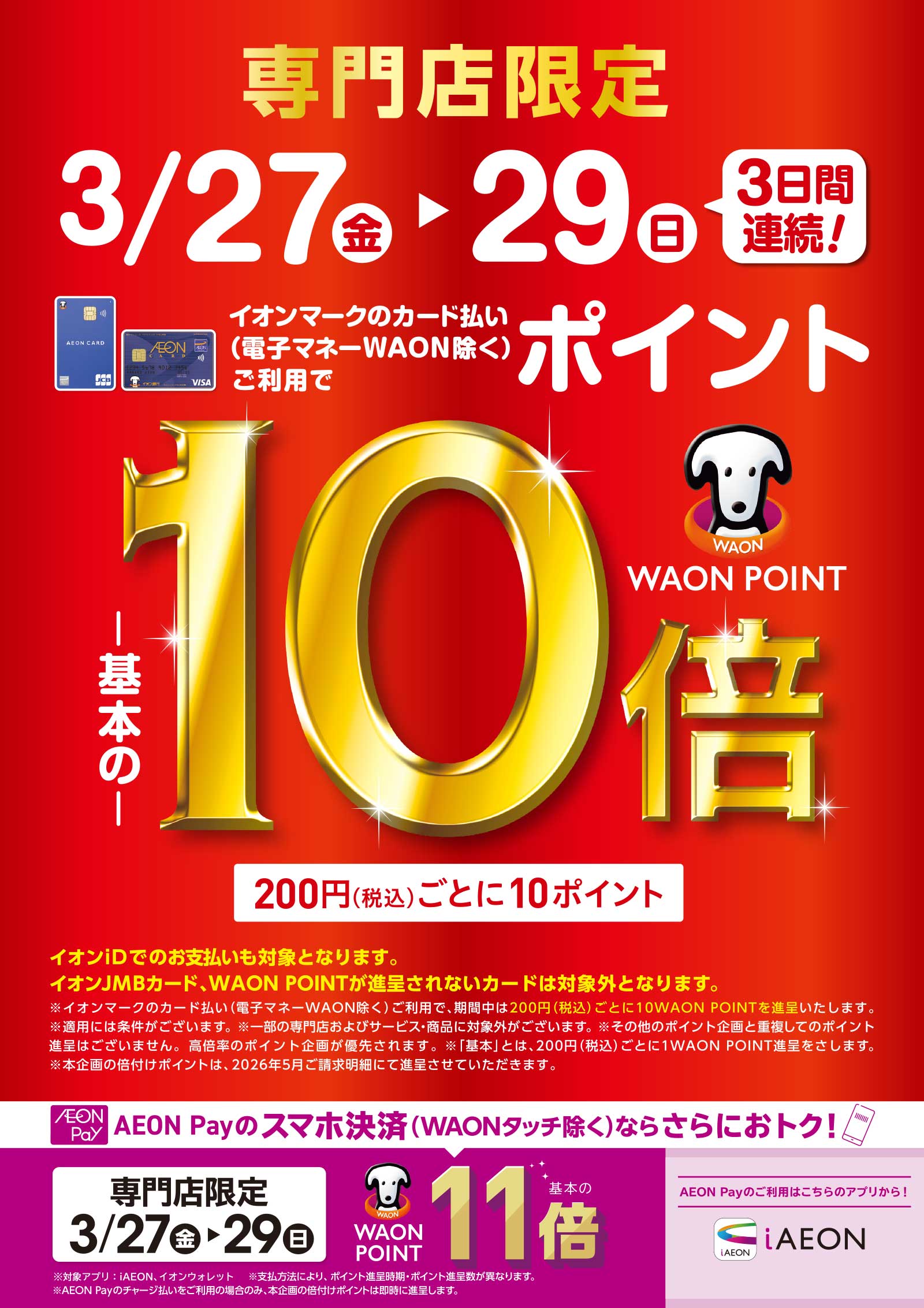 【関西エリア 対象店舗限定】イオンマークのカード払いでWAON POINT10倍・AEON Payのスマホ決済でWAON POINT11倍