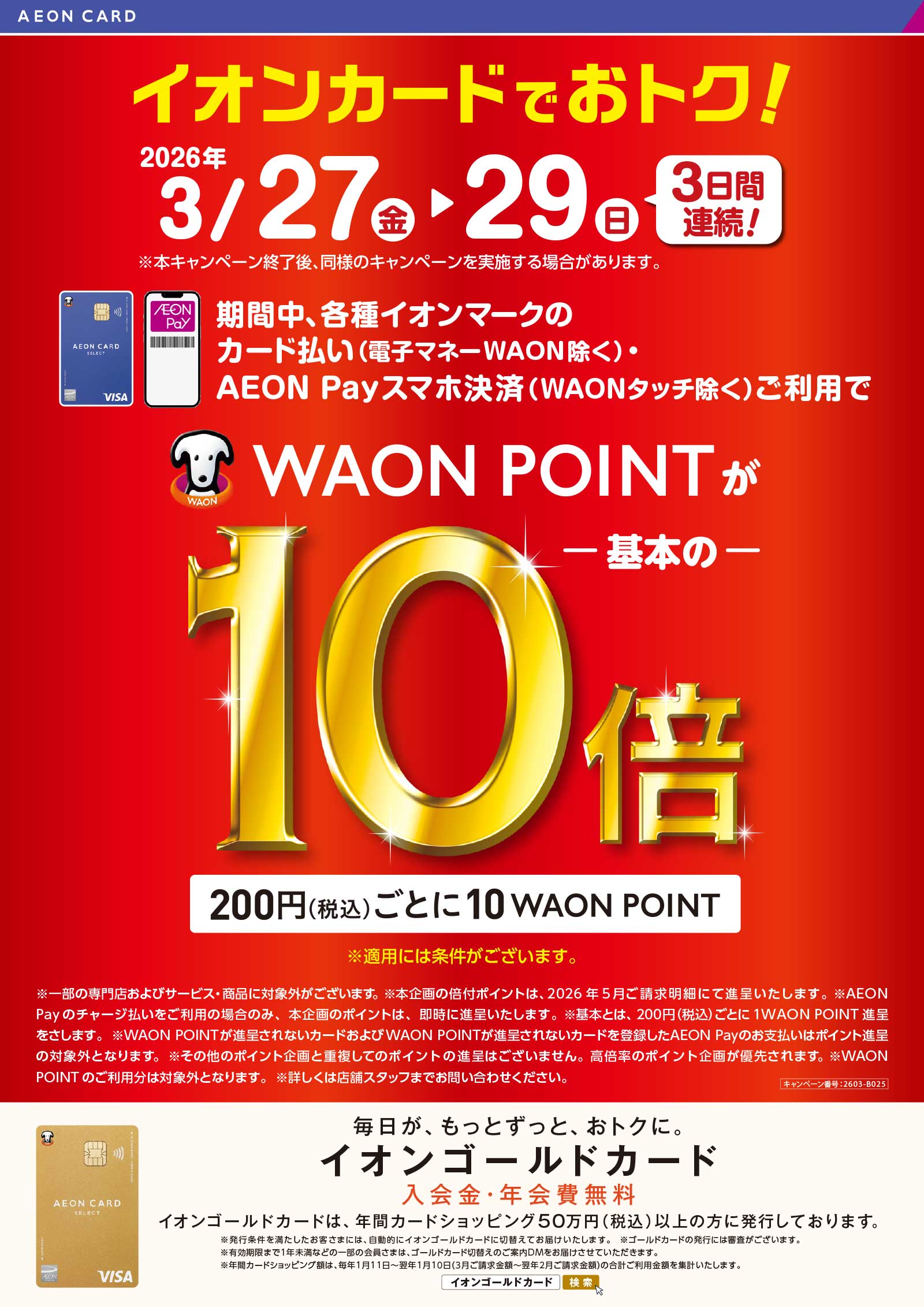 期間中、対象店舗で各種イオンマークのカード払い(電子マネーWAON除く)・AEON Payのスマホ決済(WAONタッチ除く)ご利用で、WAON POINTが【基本の10倍】たまる!