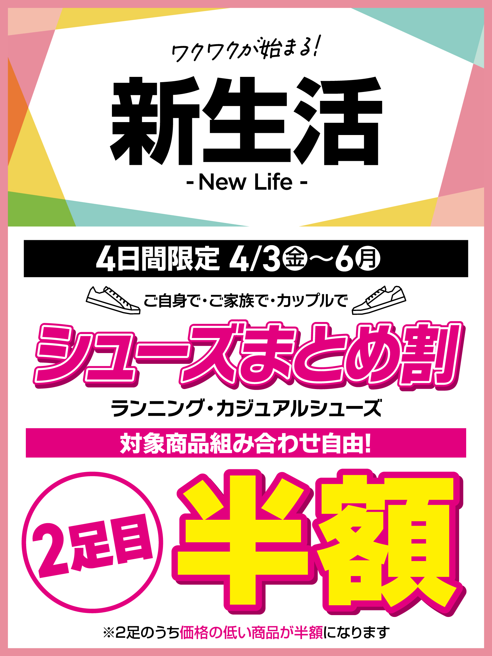ワクワクが始まる! ~ New Life ~ \ご自身で・ご家族で・カップルで/ 当社指定のシューズを2足同時購入で2足目半額! 【ランニングシューズ】【カジュアルシューズ】 対象商品組み合わせ自由! ※2足同時購入に限ります ※2足のうち価格の低い商品が半額になります ※取り扱い商品は店舗により異なります ※アウトドアステージ センター南店は【カジュアルシューズ】のみの取り扱いとなります ※オンラインショップでは企画内容が異なります