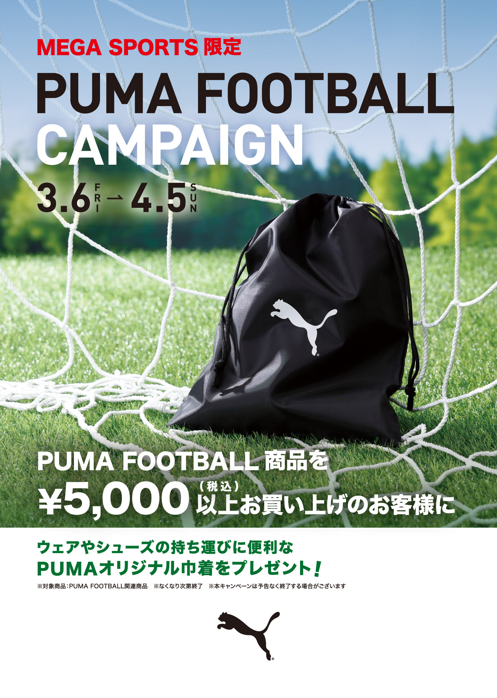 \MEGA SPORTS限定/ PUMA FOOTBALL商品を ¥5,000(税込)以上お買い上げのお客さまに、ウェアやシューズの持ち運びに便利な「PUMA オリジナル巾着」をプレゼント! ※対象商品:PUMA FOOTBALL関連商品 ※プレゼント品がなくなり次第終了とさせていただきます ※本キャンペーンは予告なく終了する場合がございます ※オンラインショップでは実施しておりません