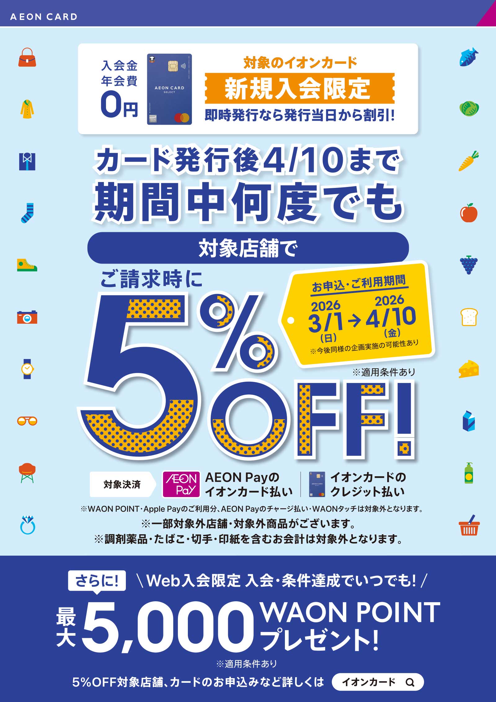 期間中に対象店舗にて対象のイオンカードにご入会いただくと、カード発行後【4月10日(金)まで】期間中何度でも対象店舗でご請求時5%OFF!