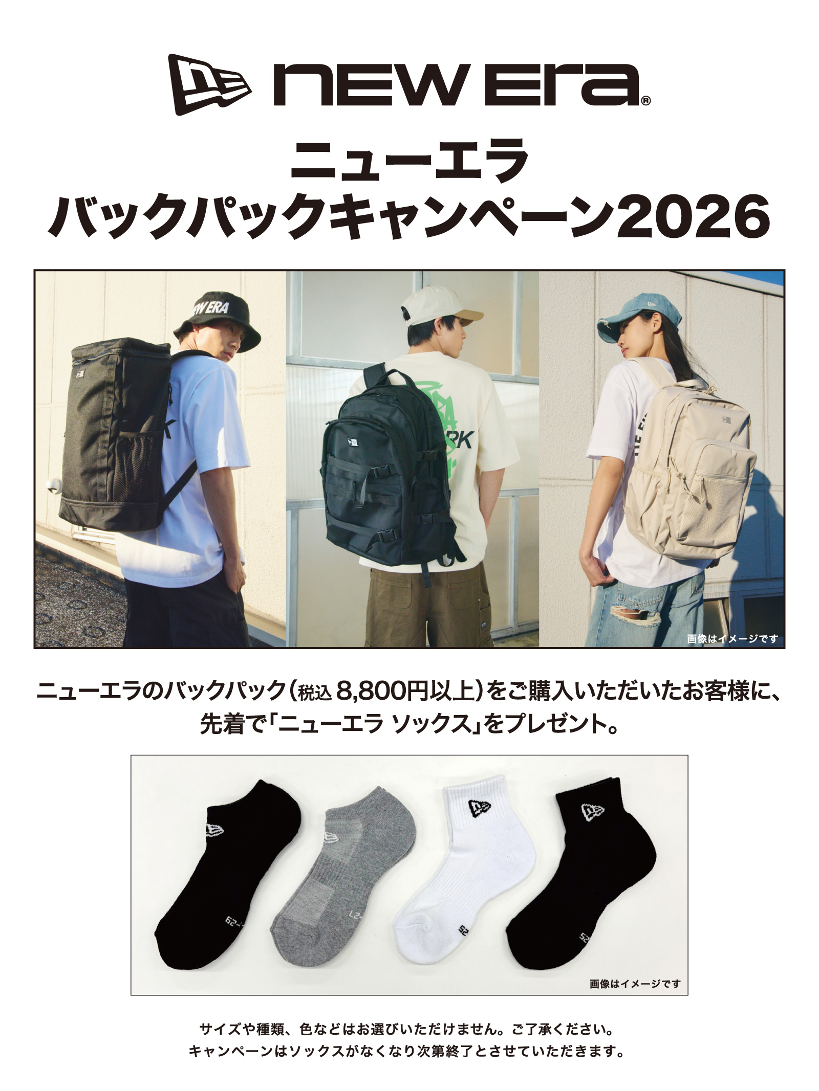 ニューエラのバックパック(税込 8,800円 以上)をご購入いただいたお客さまに、先着で「ニューエラ ソックス」をプレゼント。 ※ソックスのサイズや種類、色などはお選びいただけません。ご了承ください。 ※キャンペーンはソックスがなくなり次第終了とさせていただきます。 ※オンラインショップでは実施しておりません。