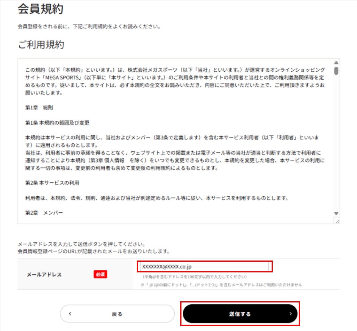 - ご利用規約をご確認の上、メールアドレスを入力して「送信する」ボタンをクリックしてください。