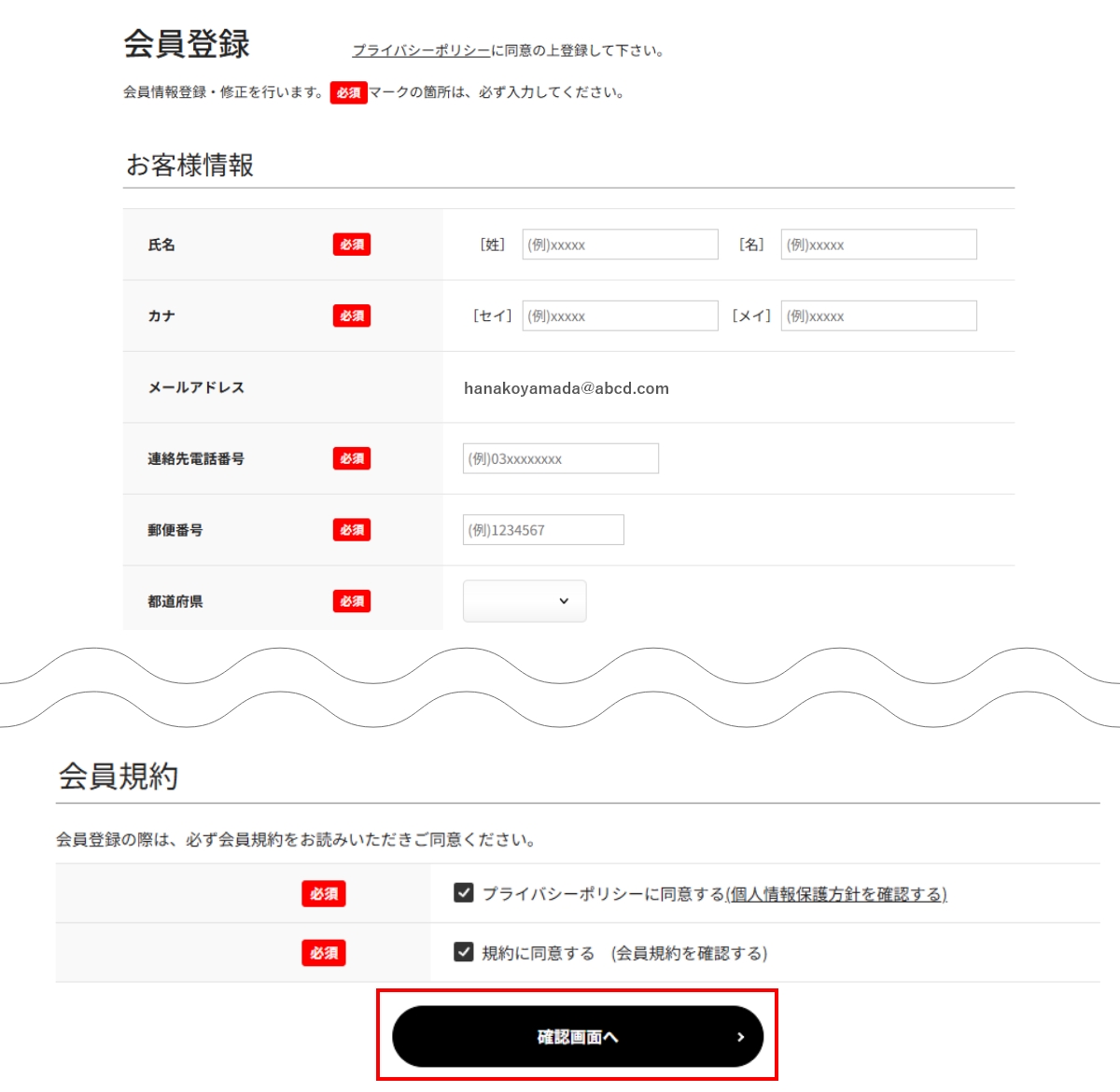 - 必須事項をご記入いただき、「会員規約」をお読みください。内容にご同意いただけましたら、チェックを入れて「確認画面へ」ボタンをクリックします。