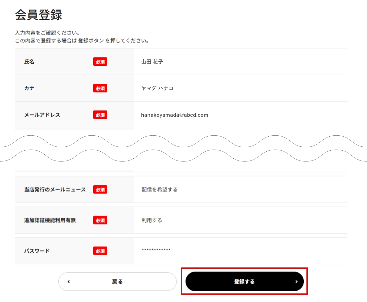 - 入力内容の確認画面が表示されます。 内容に間違いがなければ「登録する」ボタンをクリックしてください。これで会員登録は完了です。修正する場合は「戻る」ボタンで入力画面に戻ることができます。