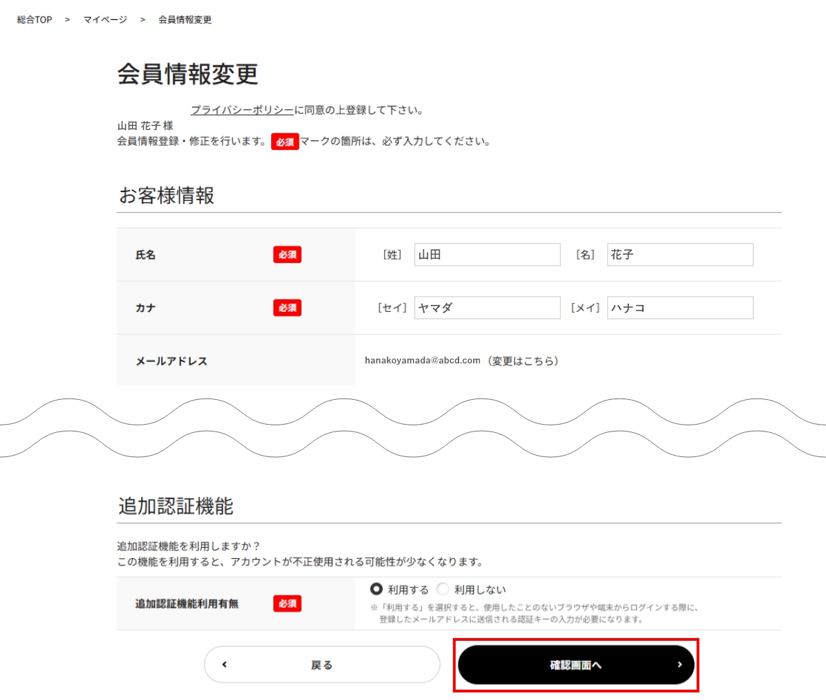 - 変更内容入力後、変更内容を確認して頂き、【確認画面へ】をクリックしてください。