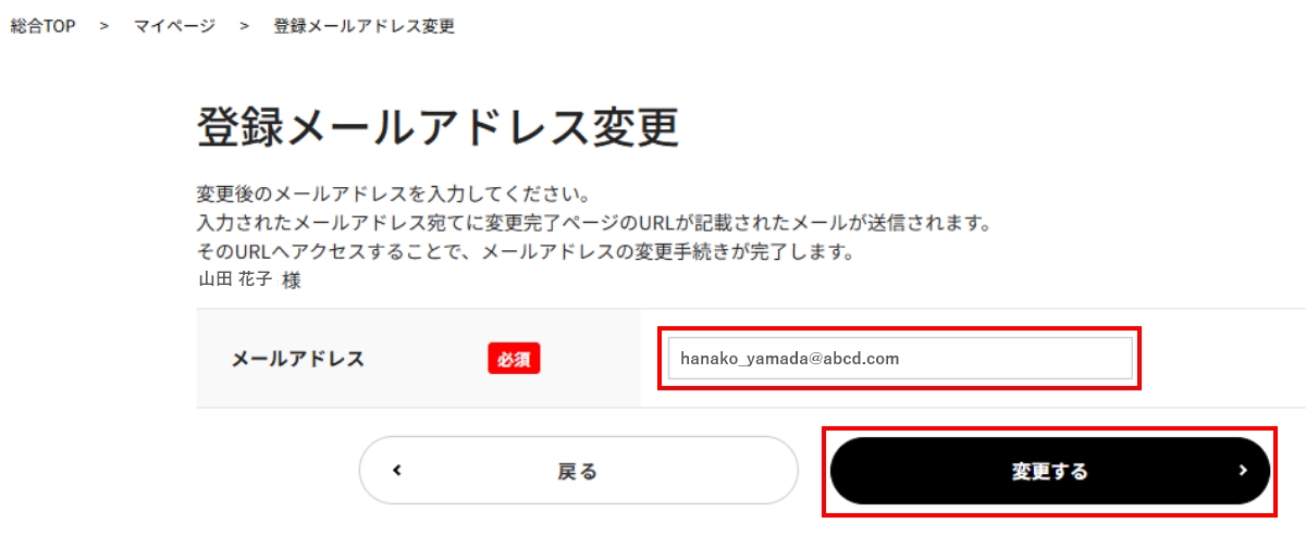 - 変更後のメールアドレスを入力後、内容に間違いがなければ「登録する」ボタンをクリックしてください。