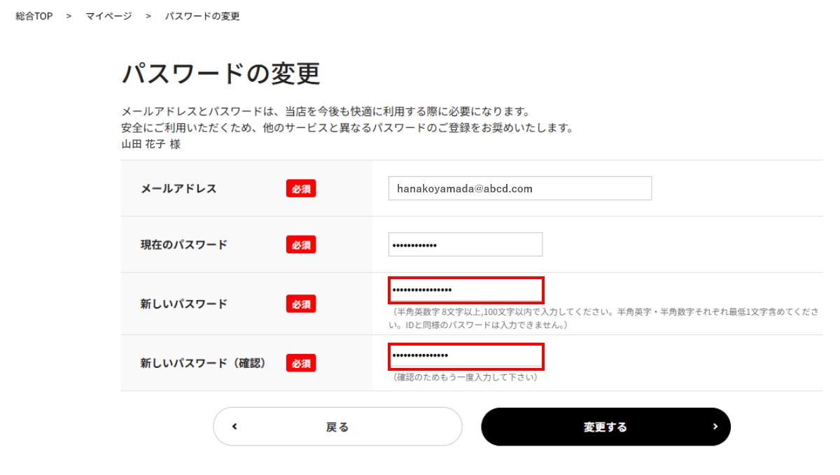 - 新しいパスワードを入力後、【変更する】をクリックして頂きますと変更が完了致します。