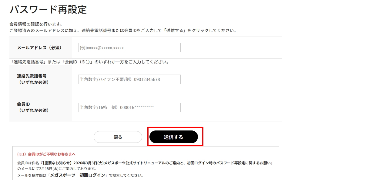 ※メールアドレスが誤って入力していた場合、【megasports.jp】 からのドメイン指定受信が出来ていない場合、メールが届かない可能性がございます。