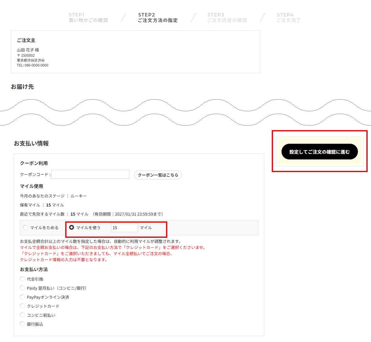 - ご注文方法の指定ページにて、ご利用可能マイルが記載されておりますので、
