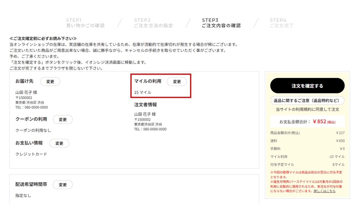 - ご注文内容確認ページにてご利用マイルに間違いがないかご確認いただき、ご注文へお進みください。