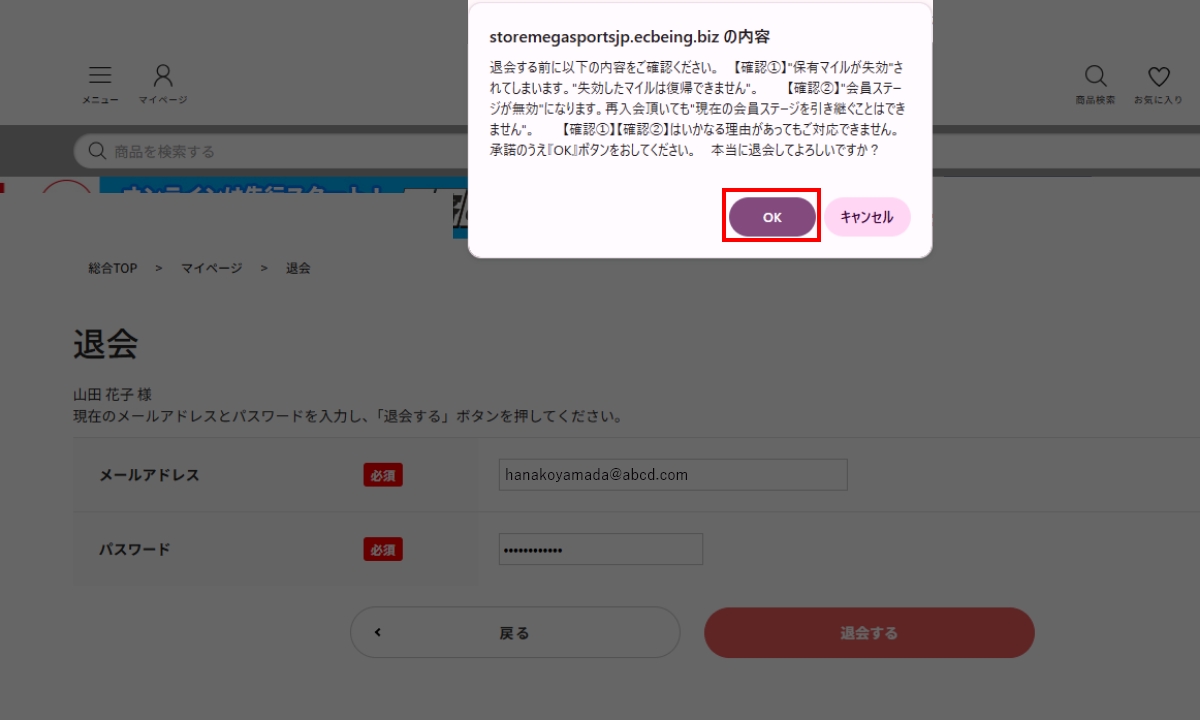 - 最後にこの画面が表示されるので、内容をご確認のうえ、「OK」をクリックすれば、退会手続きが完了です。